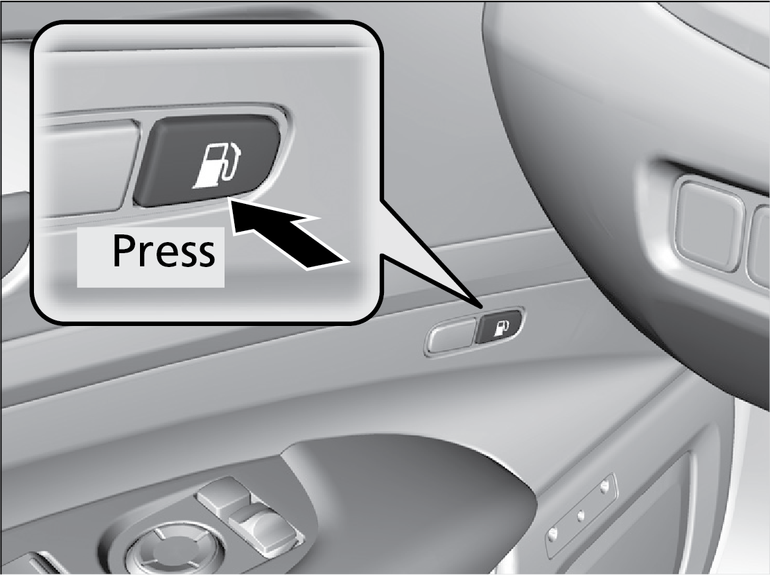 Press the area indicated by the arrow in the image to open the fuel fill door. The vehicle must be unlocked for the fuel fill door to open.