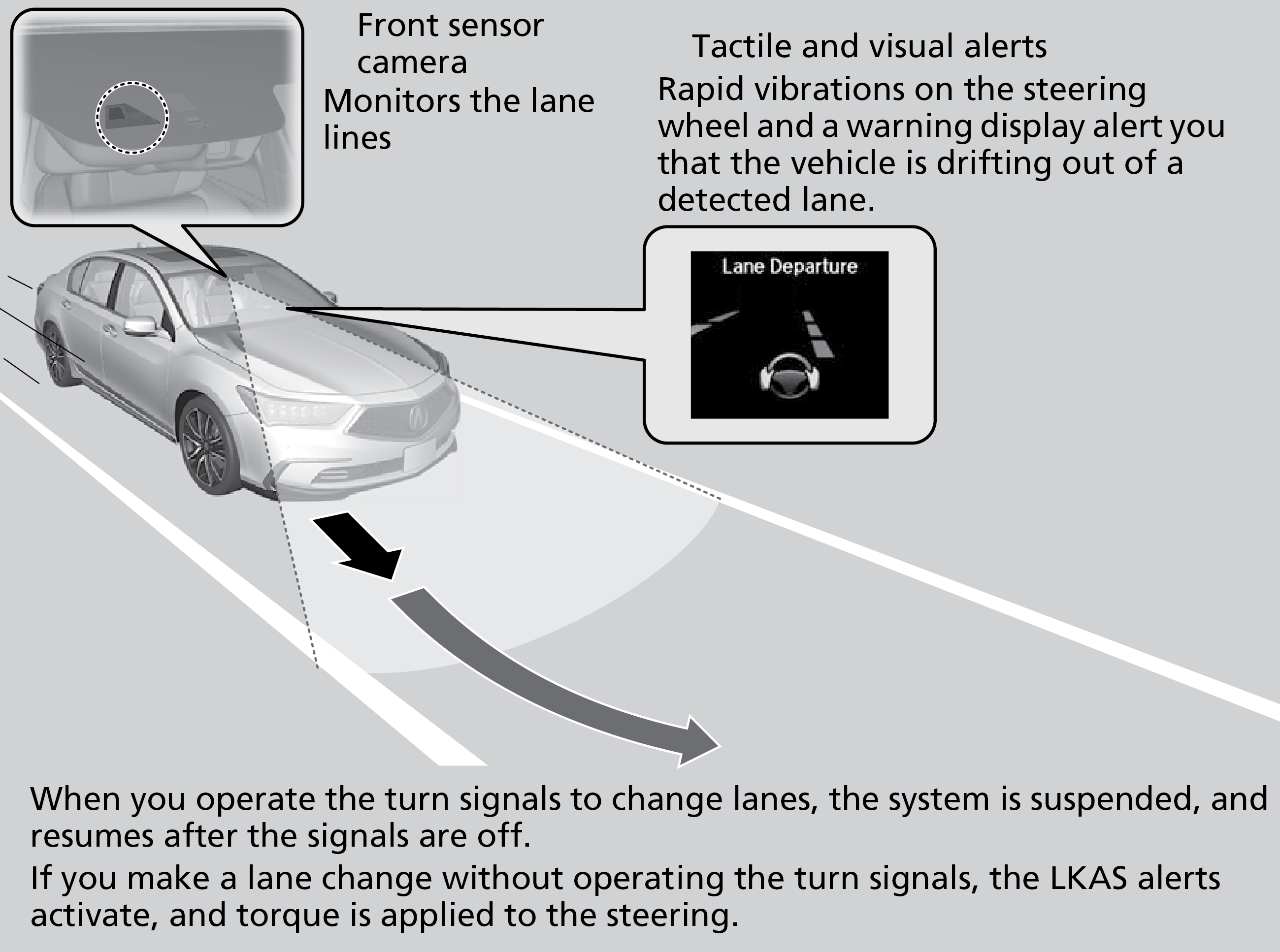 Provides steering input to help keep the vehicle in the middle of a detected lane and provides tactile and visual alerts if the vehicle is detected drifting out of its lane.