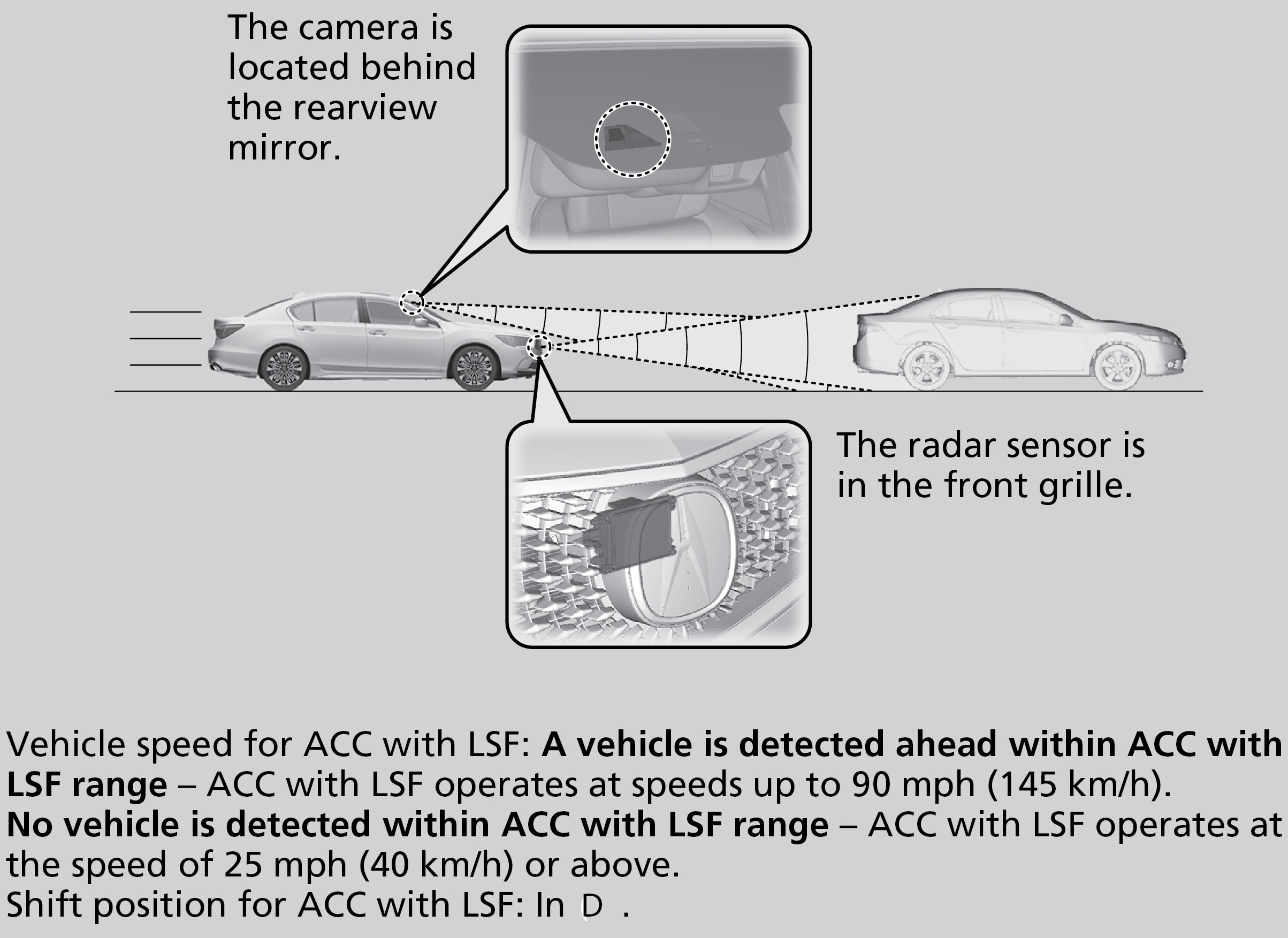 and, if the detected vehicle comes to a stop, can decelerate and stop your vehicle, without you having to keep your foot on the brake or the accelerator. When ACC with LSF slows your vehicle by applying the brakes, your vehicle's brake lights will illuminate.