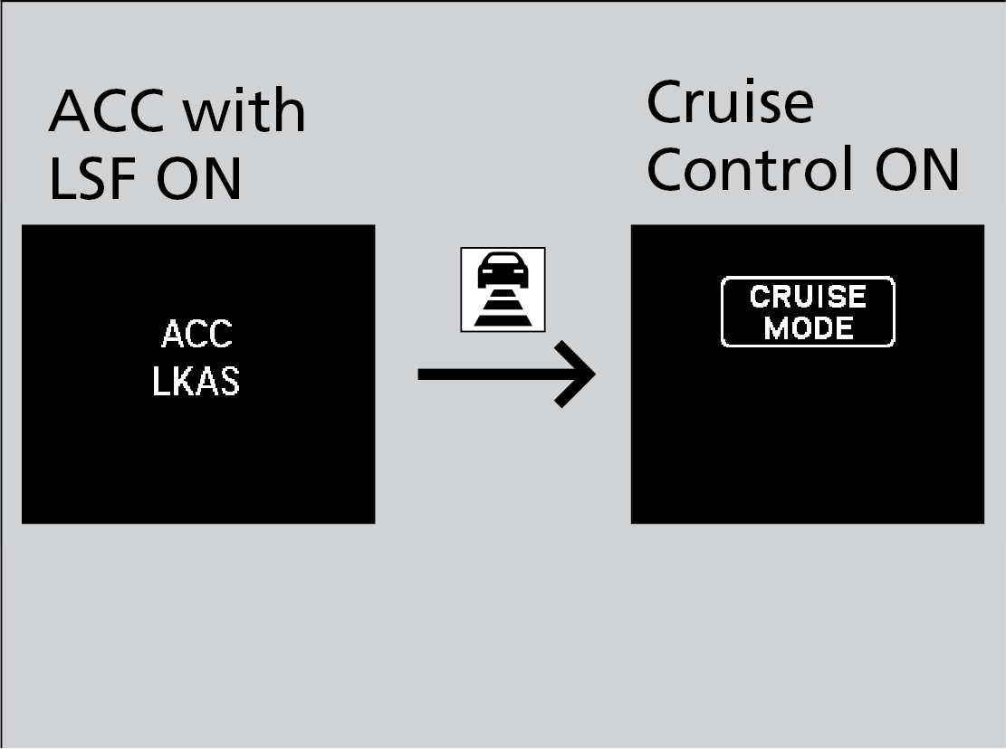 for two seconds, and then the mode switches to Cruise.. Press and hold the interval button again to switch back to ACC