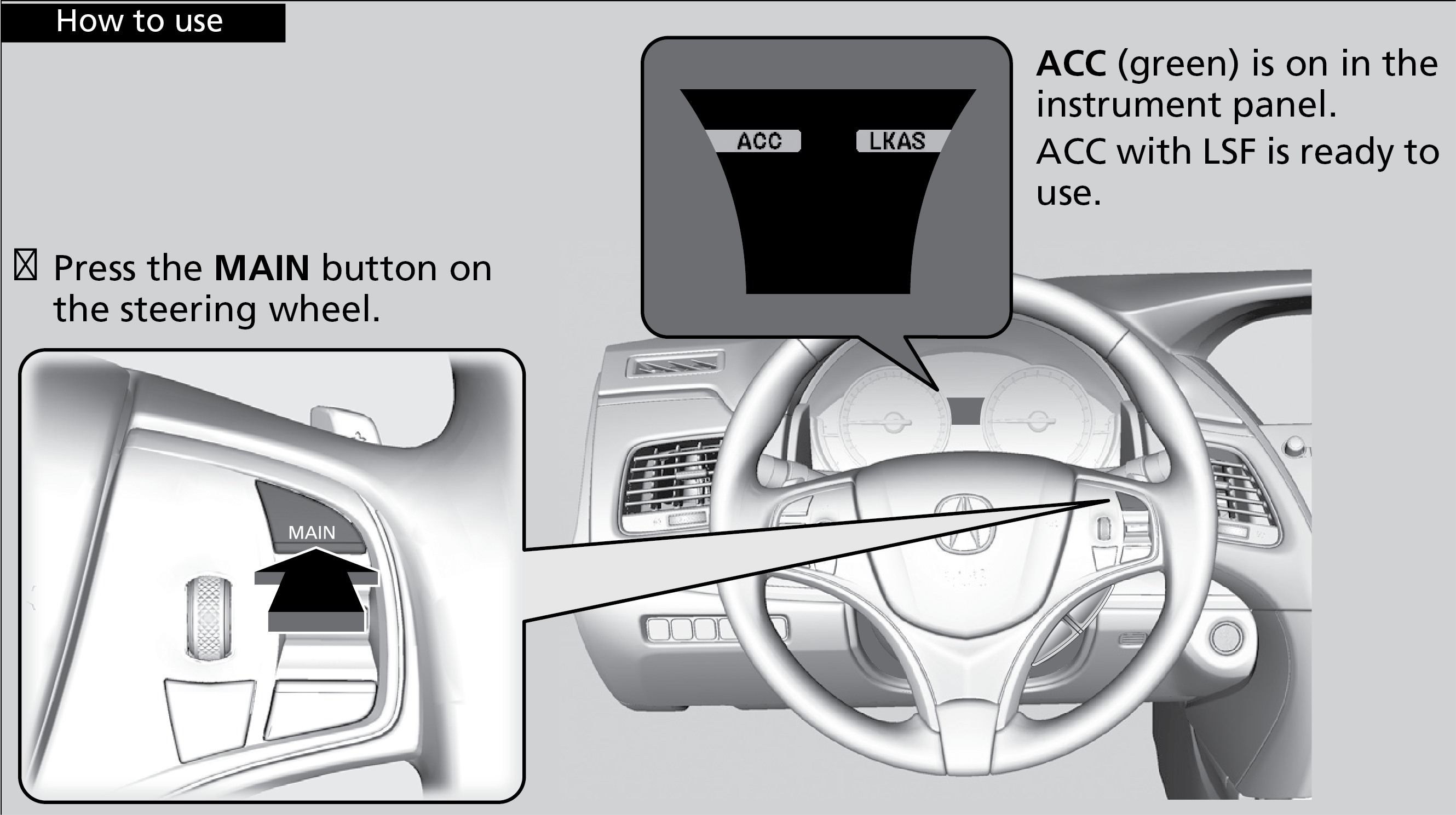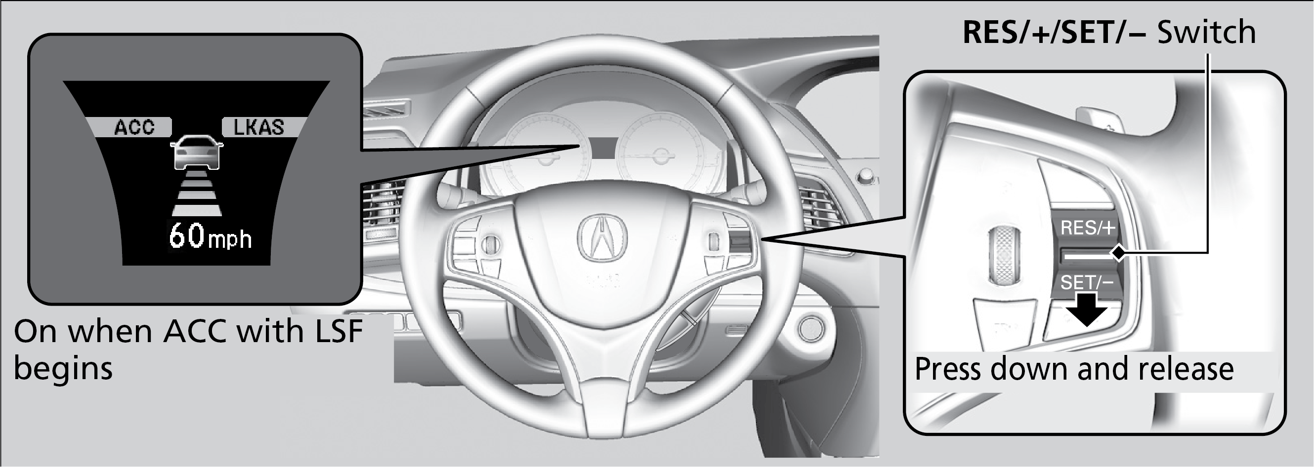 Take your foot off the pedal and press down the RES/+/SET/– switch when you reach the desired speed. The moment you release the switch, the set speed is fixed, and ACC with LSF begins.